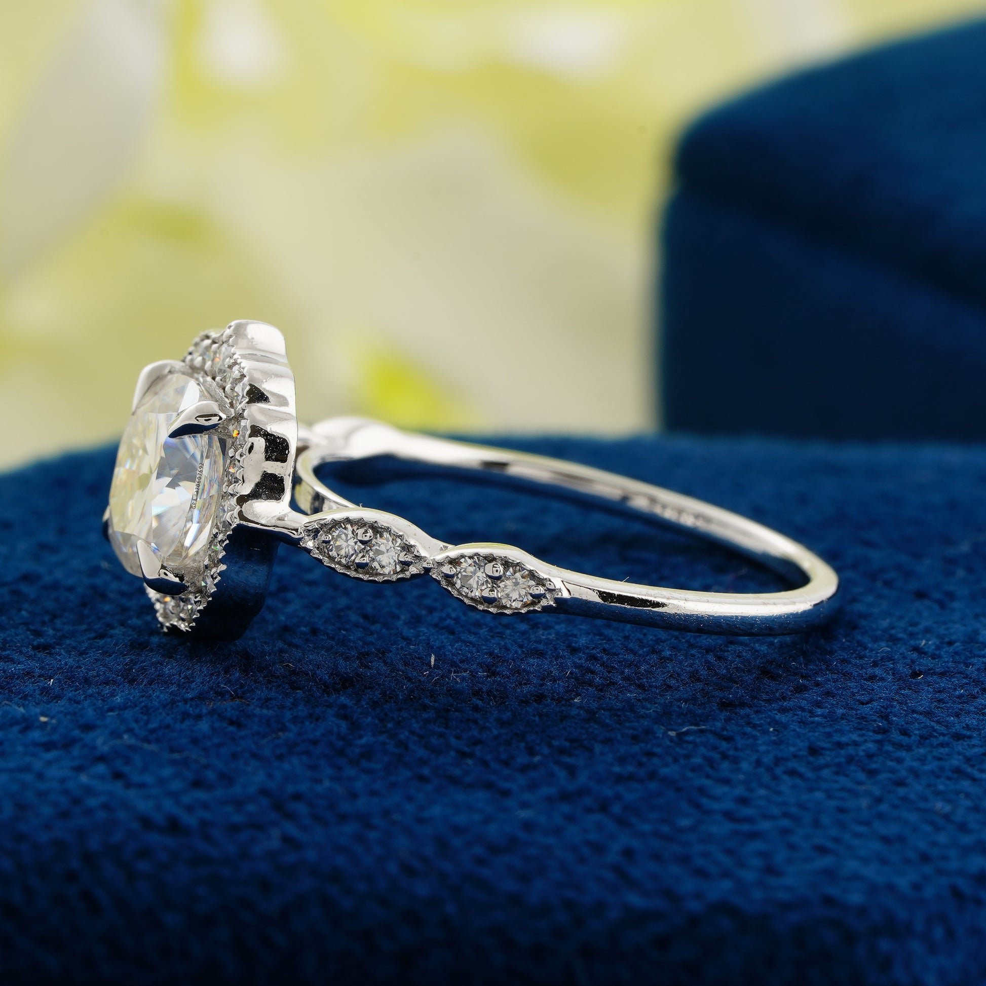 Encircled by a halo of 0.35 CT round side stones, the ring’s floral silhouette blossoms beautifully, whispering the story of a love that continues to grow with every heartbeat. Set in polished gold, this design combines vintage charm with a modern spirit — perfect for someone whose grace inspires every day.