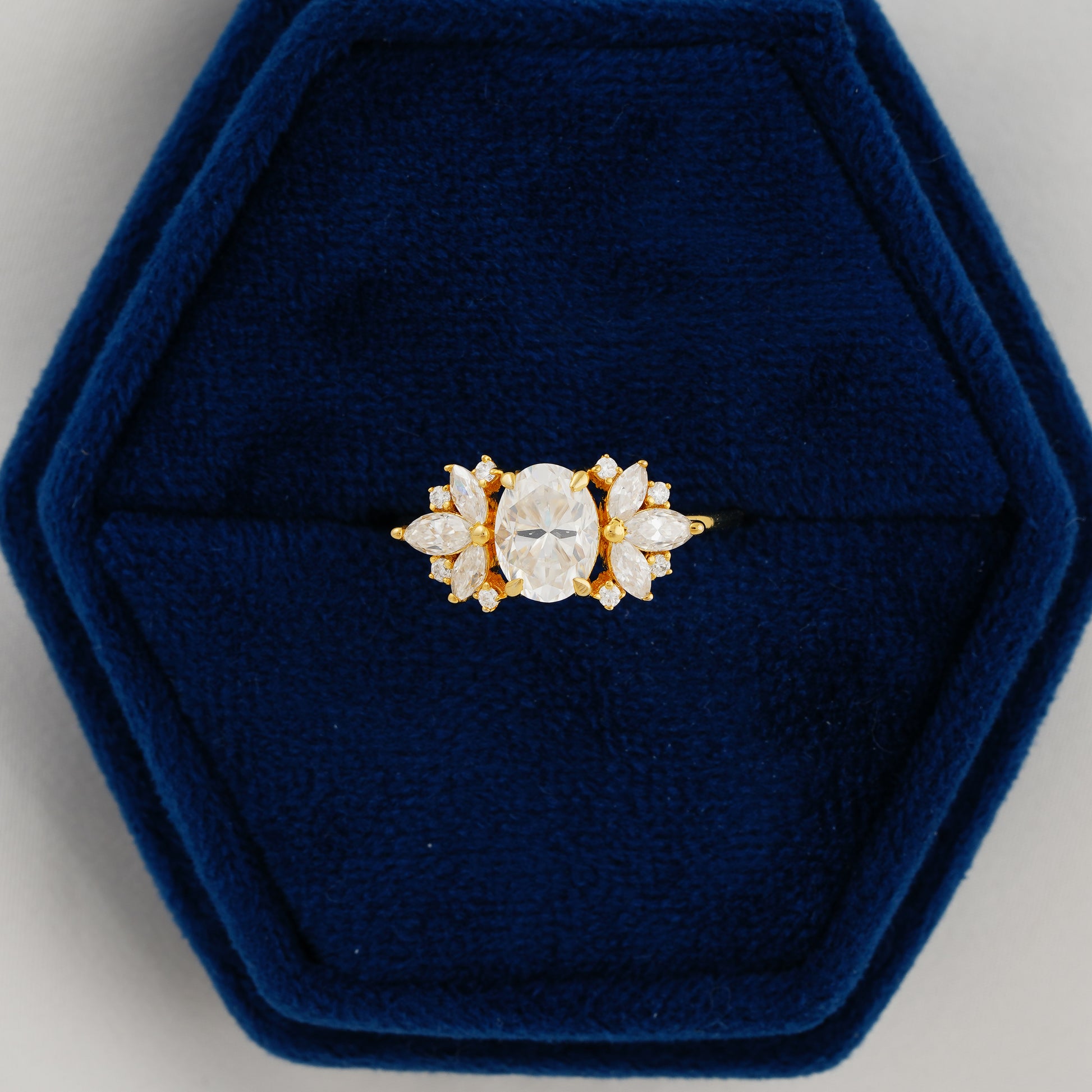 ✦ A radiant promise — this 1.33 CT Oval Cut Lab Grown Diamond Engagement Ring is beautifully accented with 0.46 CT marquise side stones for a balanced, floral-inspired look.