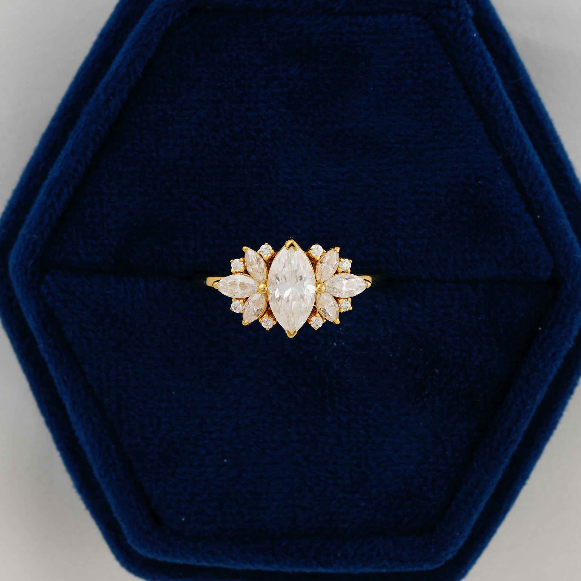 ✦ A graceful blend of timeless elegance — this 1 CT Marquise Cut Lab Grown Diamond, highlighted with dazzling marquise and round side stones, creates a radiant floral-inspired look.